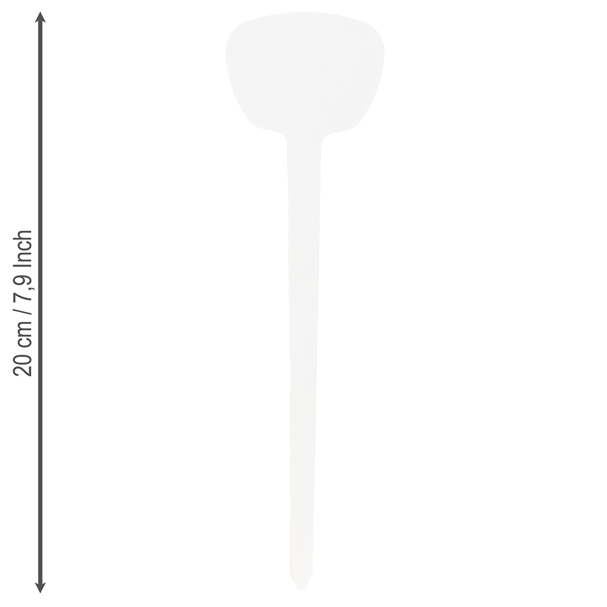 Die Pflanzstecker zum Beschriften bestehen aus feinem aber formstabilem Kunststoff. So sind die Blumen-Steckschilder wasserfest und wiederverwendbar. Dank des angespitzten Stabes können Sie die Pflanzenschilder zum Stecken leicht in die Blumenerde beziehungsweise in das Beet hineinschieben.