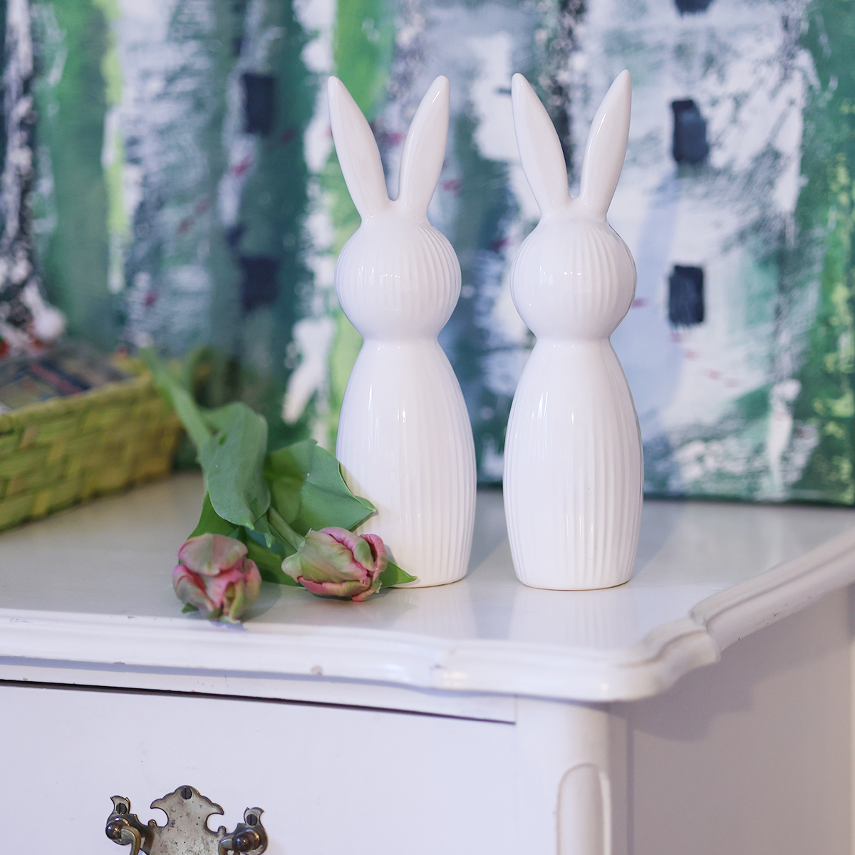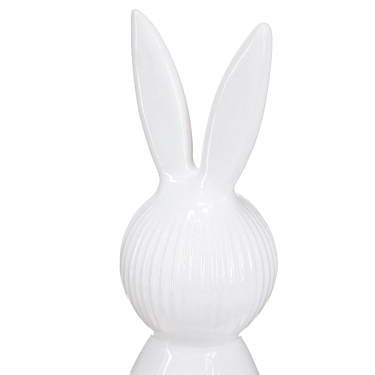 Die schlichte Hasenfigur aus hochwertiger Keramik zeichnet sich durch ihre einzigartige Verbindung aus minimalistischem Design und Funktionalität aus. Die hochglänzende Oberfläche verleiht den Figuren eine besondere Tiefe und Spiegelung, wodurch sie sich sofort in den Mittelpunkt Ihrer Dekoration stellen. Sie sind perfekt geeignet für Frühlings- und Osterdekorationen, sei es auf dem Ostertisch, einem modernen Osterstrauß oder als ein subtiler Blickfang auf Ihrer Empfangstheke. Ihre Höhe von 22 cm bildet dabei die ideale Balance zwischen Präsenz und Zurückhaltung. Die leicht geriffelte Oberfläche macht die Hasenfigur nicht nur optisch, sondern auch haptisch zu einem Erlebnis. Wer es schlicht, aber elegant mag, wird Gefallen an der neutralen weißen Farbe finden. Sie harmoniert wunderbar mit nahezu jedem stilistischen Arrangement: moderne Glaskerzenständer, minimalistisch designte Vasen oder andere helle Frühlings-Accessoires. Ob Sie diese Dekohasen einzeln oder im Set als Paar im Raum wirkungsvoll positionieren, bleibt ganz Ihrer Kreativität überlassen! Ein kleiner Tipp: Ergänzen Sie die Figuren mit weiteren weißen Keramik-Dekoelementen oder kombinieren Sie sie mit pastellfarbenen Highlights – so schaffen Sie harmonische Akzente für eine rundum gelungene Frühlingsdekoration.