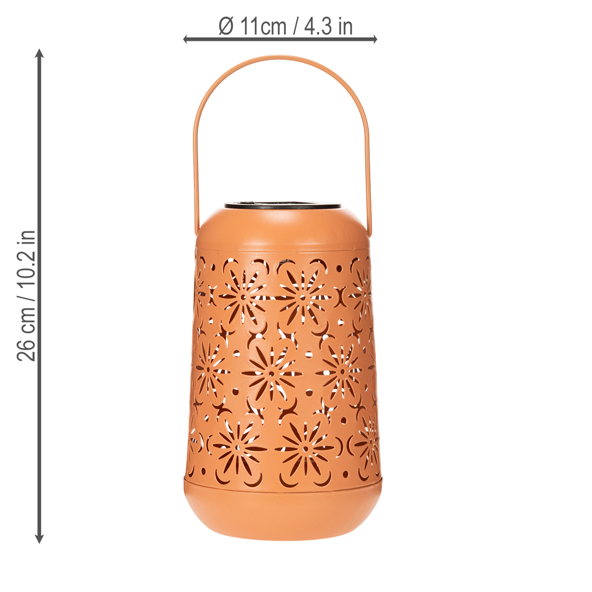 Mit ihrer warmen Lichtfarbe und dem floral verzierten Muster zaubert diese Solar-Laterne eine einladende Atmosphäre in jeden Außenbereich. Die filigranen Blumenmuster verleihen dem Garten einen Hauch von Eleganz und etwas Boho-Flair. Die hochwertige Verarbeitung in einem dezenten Orange harmoniert perfekt mit modernen wie auch klassischen Gartenstilen. Egal, ob Sie bei lauen Sommerabenden für romantische Lichtakzente sorgen möchten, die Terrasse mit stilvoller Beleuchtung schmücken oder eine dekorative Lösung für ein Gartenfest suchen – diese Outdoor-Solar-Lampe ist mehr als nur eine Lichtquelle. Sie ist ein Highlight in jedem Außenbereich.