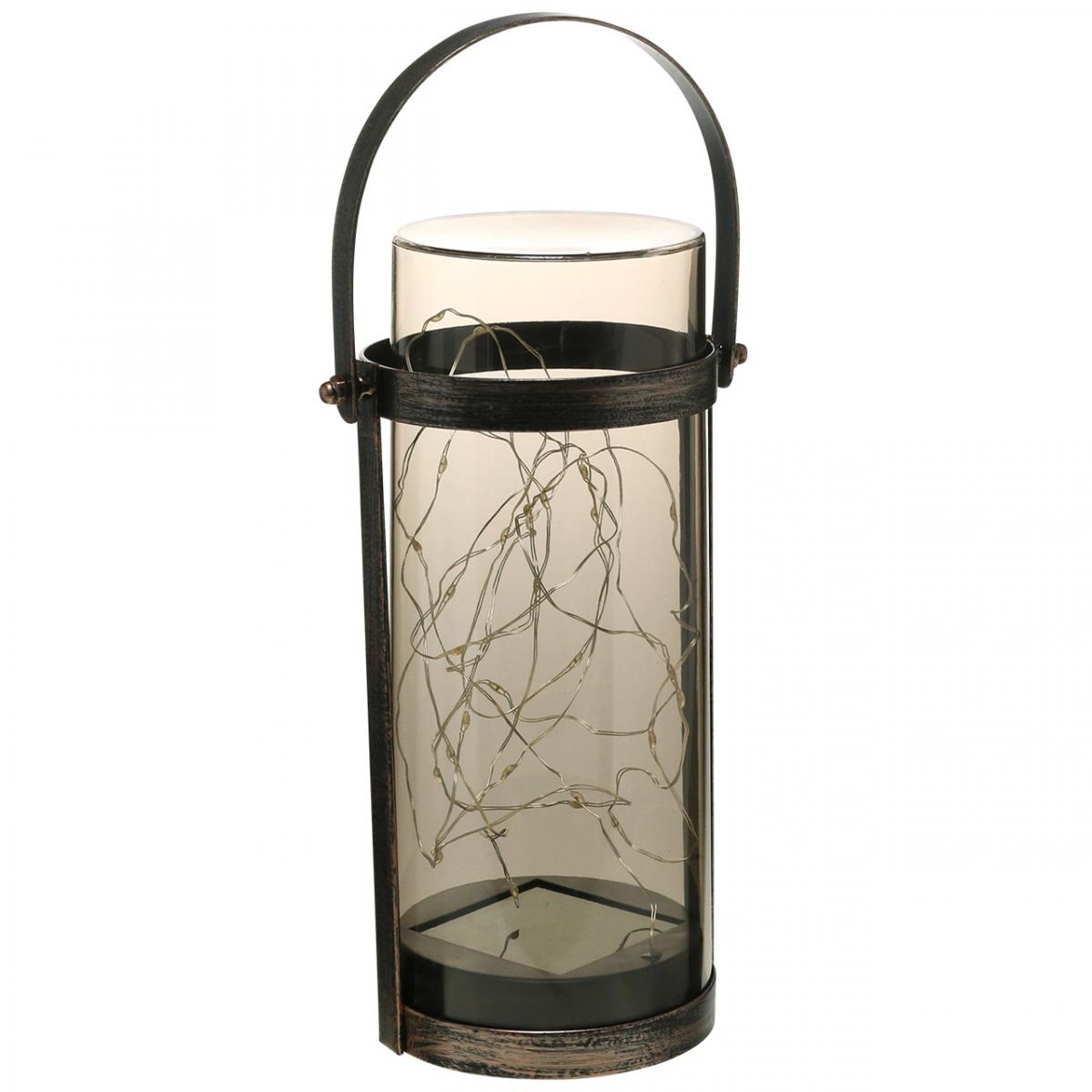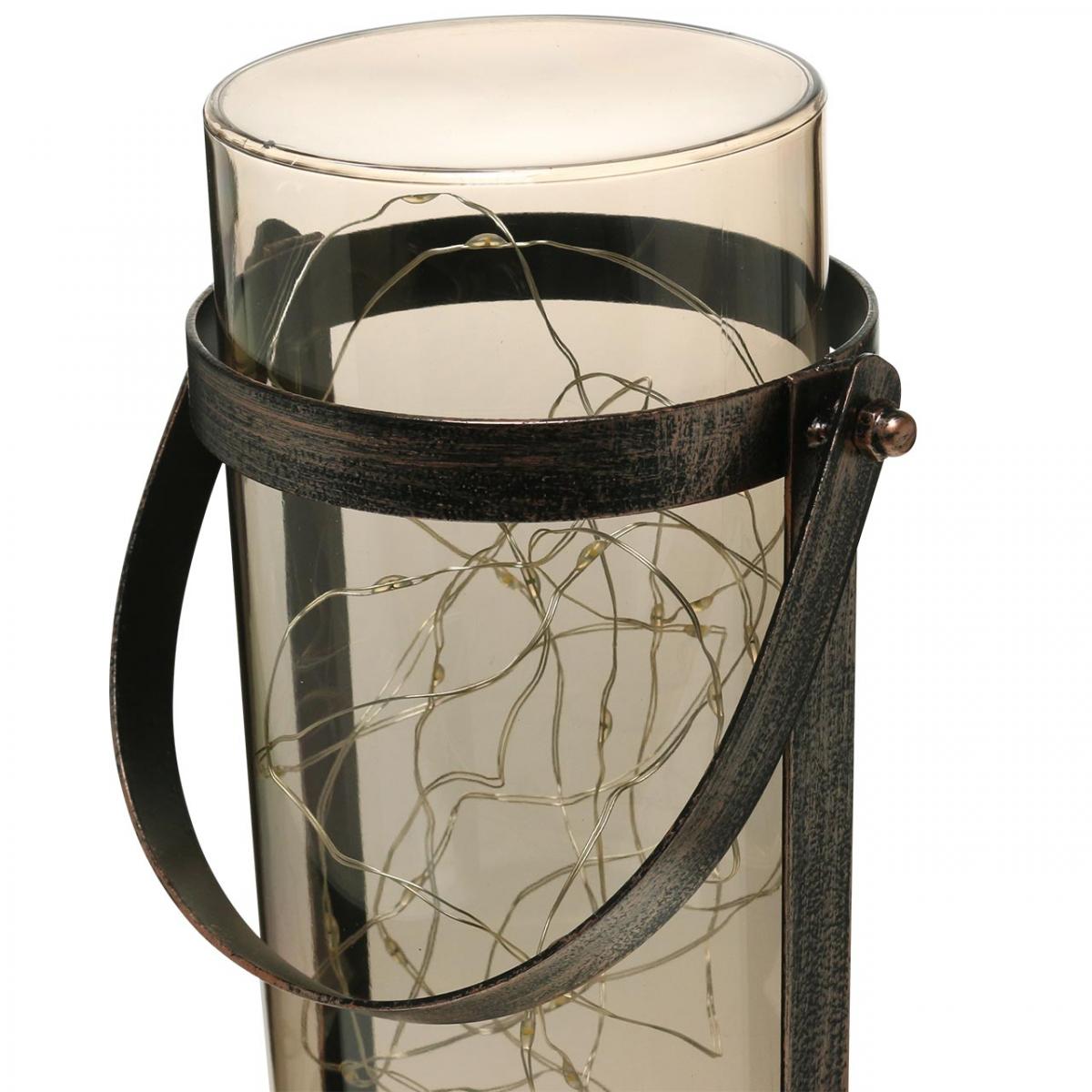 Mit dieser Solarleuchte können Sie nicht nur wunderbar Licht ins Dunkel Ihres Gartens bringen, zudem lädt die aus getöntem Acrylglas bestehende Lichtröhre zum Dekorieren ein. Als Gartenlaterne in ein Metallgestell in rustikalem Messing-Schwarz eingesetzt und mit 30 Micro-LEDs in Warmweiß beleuchtet kann die Solarlampe mit beweglichem Henkel getragen, aufgehängt oder gestellt werden.Im Boden der Gartenleuchte befindet sich ein Solarmodul, das nach genügend Sonnenlichteinstrahlung die LEDs der Drahtlichterkette im Inneren des Acryltubus zum Leuchten bringt. – So wirken die kleinen Lichtpunkte beinahe wie kleine Glühwürmchen, die in der Solar-Laterne umherfliegen und leuchten.