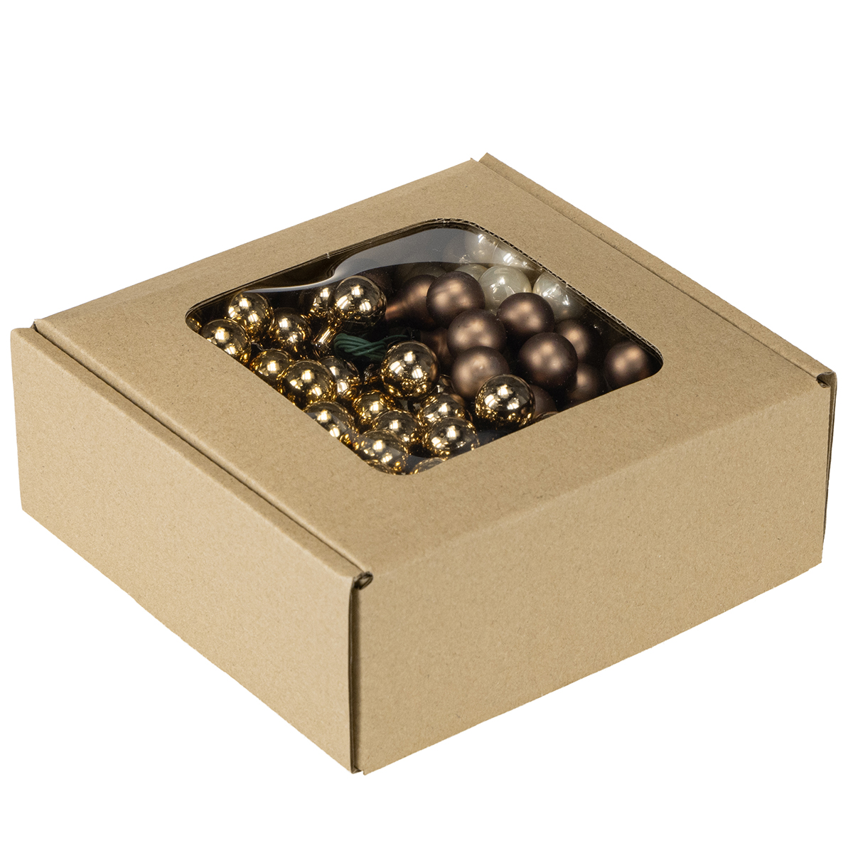 Die Spiegelbeeren in Braun-Gold befinden sich in einer Set zu 140 Stück mit insgesamt 4 verschiedenen Farben zu gleichen Teilen: Altgold, Weiß und Grünbraun in Glänzend sowie Rehbraun in Matt. Die kleinen Glasköpfe haben alle einen Durchmesser von circa 1,5 Zentimeter und inklusive grünem Basteldraht eine Größe von etwa 15 Zentimeter.