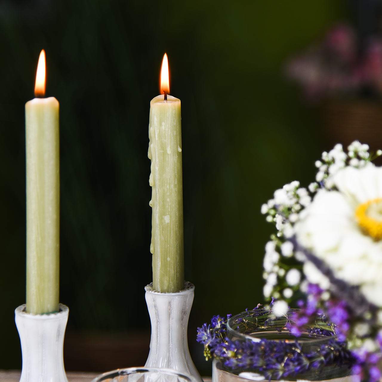 Das helle Olivgrün macht insbesondere im Zusammenspiel mit Naturdeko einen sehr natürlichen Eindruck. Selbstverständlich sollten Sie die Kerzen immer im sicheren Abstand von allen brennbaren Materialien, im sicheren Kerzenhalter oder in einem Glas aufstellen. Die Wachskerzen sehen mit dunklem Holz oder gelben Blüten unglaublich stimmungsvoll aus. Doch auch in der Kombination mit Rot als Weihnachtsdeko erzielen die Deko-Kerzen einen schönen Farbeffekt. Dieser ökologische Eindruck spiegelt sich auch in der plastikfreien Verpackung der Kerzen wieder.