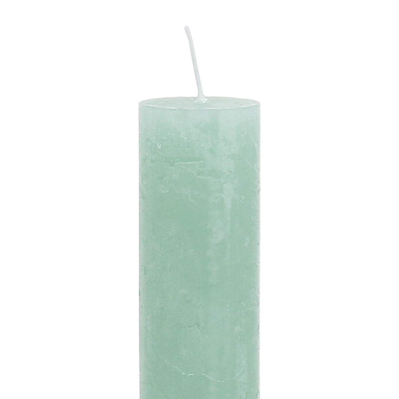 Die durchgefärbten Stabkerzen in Hellgrün, die Sie im 4er-Set in einer Verpackung aus Pappe und Kunststoff erhalten, sind circa 300 Millimeter hoch und messen im Durchmesser rund 34 Millimeter. Die Brenndauer der Premiumkerzen beträgt etwa 30 Stunden.