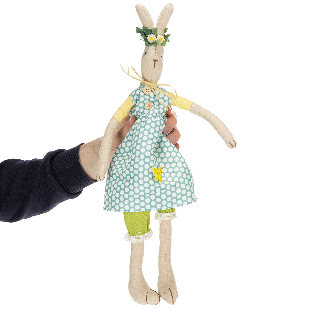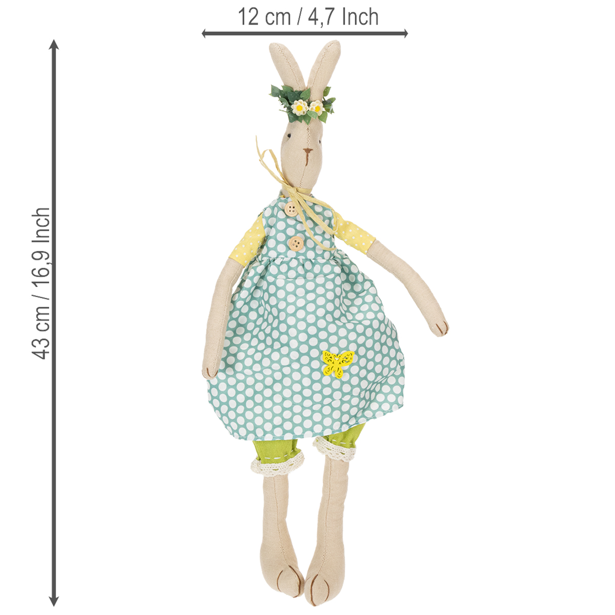 Das niedliche Hasenmädchen ist aus schlichtem Naturstoff gefertigt und trägt ein frühlingshaftes blaues Kleid mit großen weißen Punkten. Darunter Ärmel in Gelb-Weiß und eine hübsche grüne Pluderhose mit Spitzenrand vervollständigen das Outfit des Hasen mit Kleid. Die schöne Häsin bezaubert zudem mit wundervollen Details wie Holzknöpfen und einer Schmetterlingsdeko am Gewand sowie einer schlichten Schleife aus Papierband um den Hals. Auf dem Kopf trägt der Stoffhase einen filigranen Blumenkranz der seine Optik vollendet.