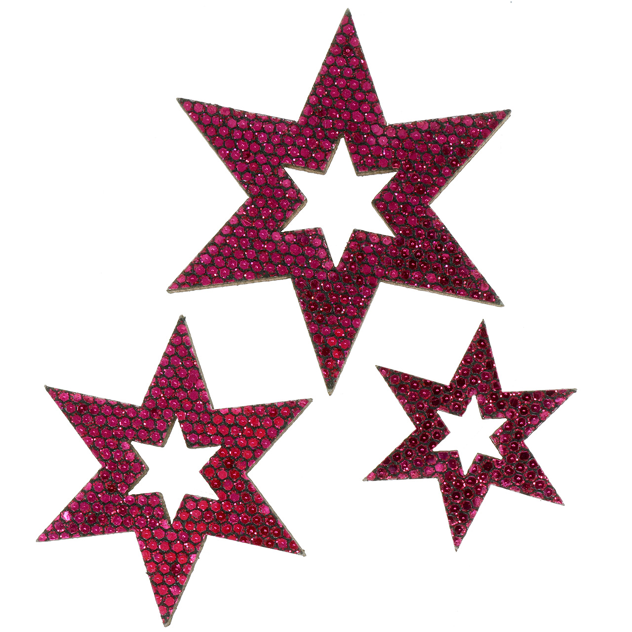 Die Sterne aus Holz in Lila werden in einer Box zu insgesamt 48 Stück geliefert. Die Holzsterne haben Größen von ungefähr 3 bis 5 Zentimeter.