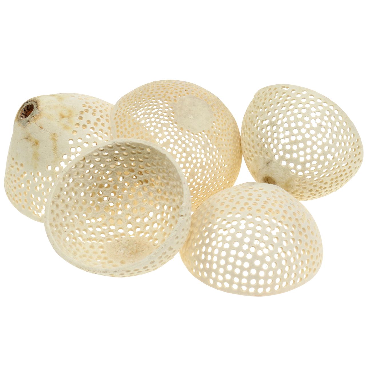 Die gebleichten Trockenfrüchte der Art Bell Cup erhalten Sie im Set zu insgesamt 10 Stück. Jedes Exemplar besteht komplett aus Holz. Der Durchmesser variiert zwischen circa 8,5 und 11 Zentimetern.