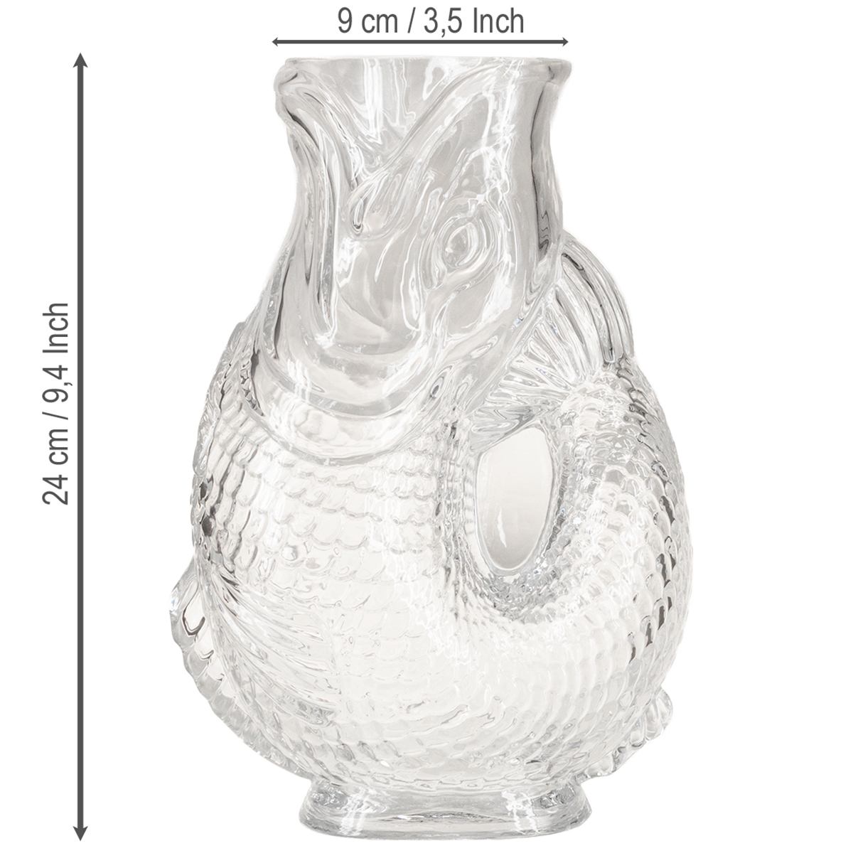 Das robuste Glas trifft auf einen geschmackvollen Fischentwurf, bei dem jedes Detail, von Schuppenstruktur bis zur Schwanzflosse, liebevoll gestaltet wurde. Die durchscheinende Optik erinnert an den Glanz von Wasser und verleiht Ihrer Dekoration Leichtigkeit und Raffinesse. Ob als Geschenk oder für die eigenen vier Wände – diese Fischvase ist ein Hingucker, der Geschichten erzählt.