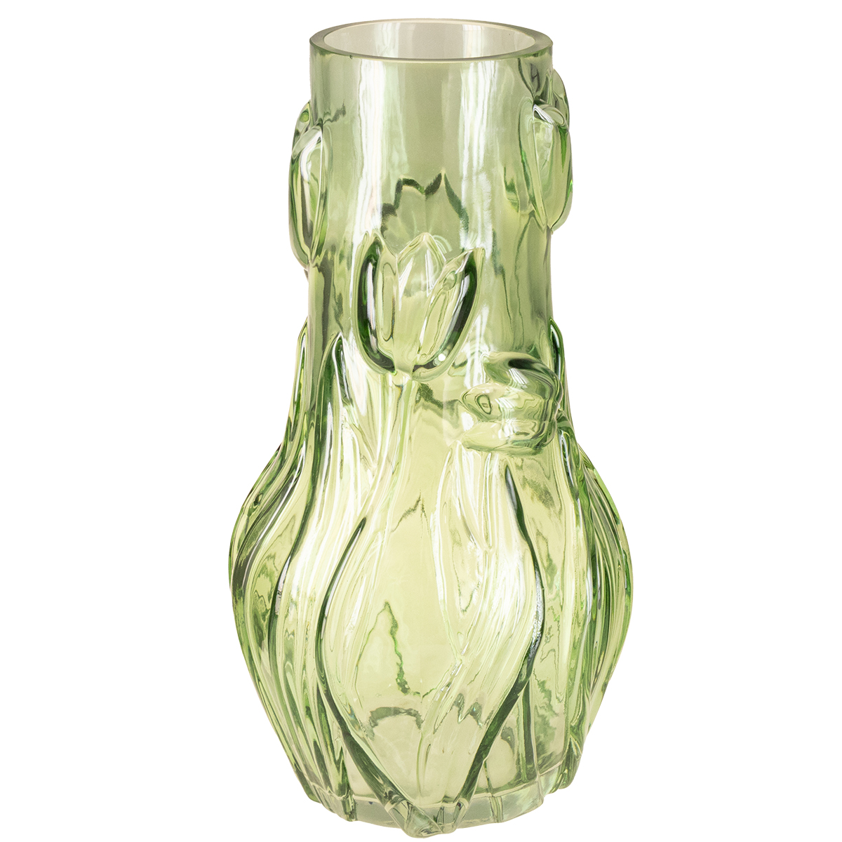 Die 30 cm hohe Glasvase in ihrem klaren, grünen Farbton besticht durch ihren zeitlos eleganten Charakter. Ihr einzigartiges Tulpenmuster bringt ein Stück Natur direkt in Ihre vier Wände. Die Kombination aus glänzendem Glas und dem sanften Grünton setzt dezente Farbakzente, ohne dabei aufdringlich zu wirken. Mit einem Durchmesser von 16 cm bietet die Vase ausreichend Platz für üppige Blumenarrangements, ohne überladen zu wirken.