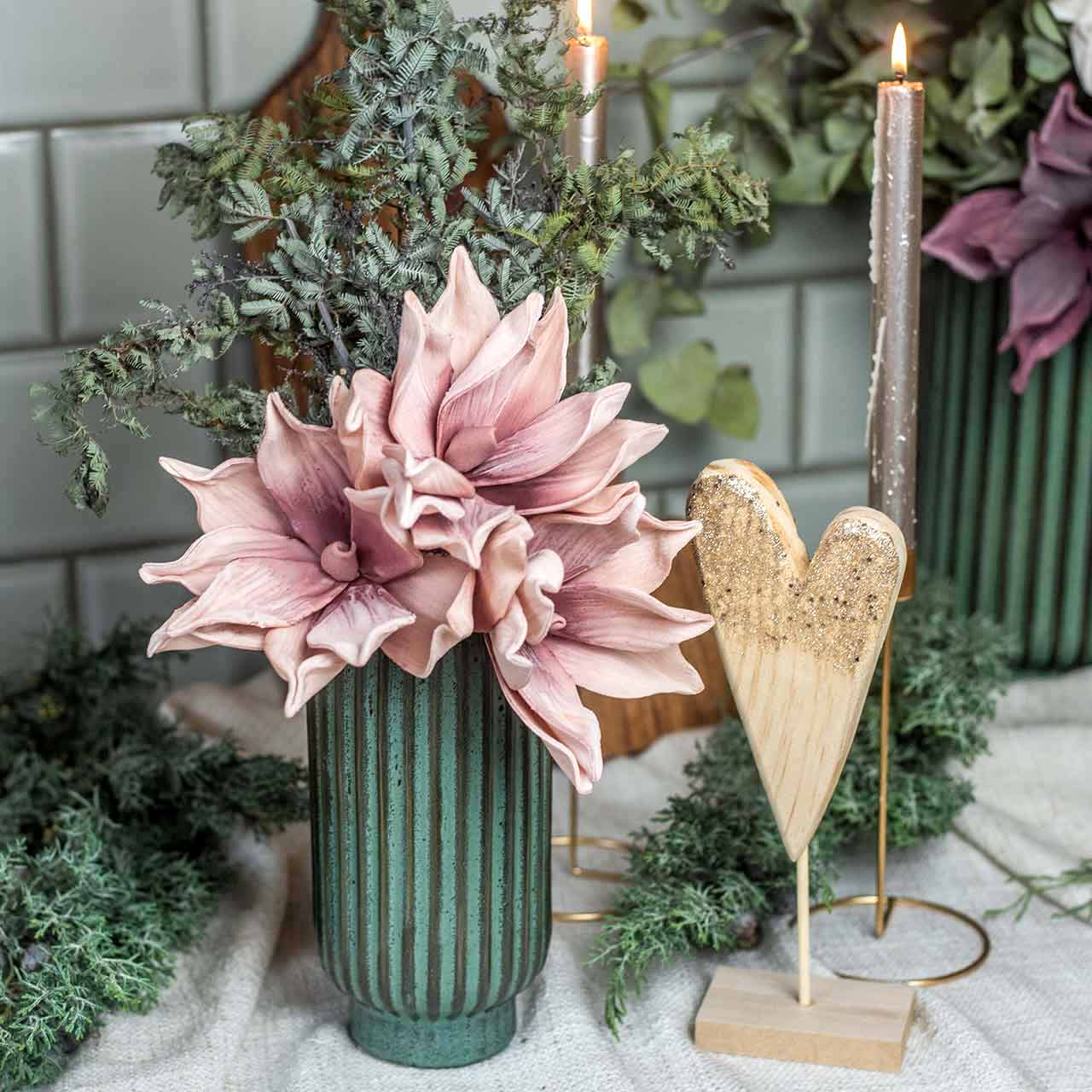Diese Vase aus Keramik ist ein perfektes Element für eine stilvolle Blumendeko für den Tischschmuck. – Die geriffelte Dekovase in Grün-Braun eignet sich vielfältig für floristische Dekoideen zu jeder Jahreszeit!