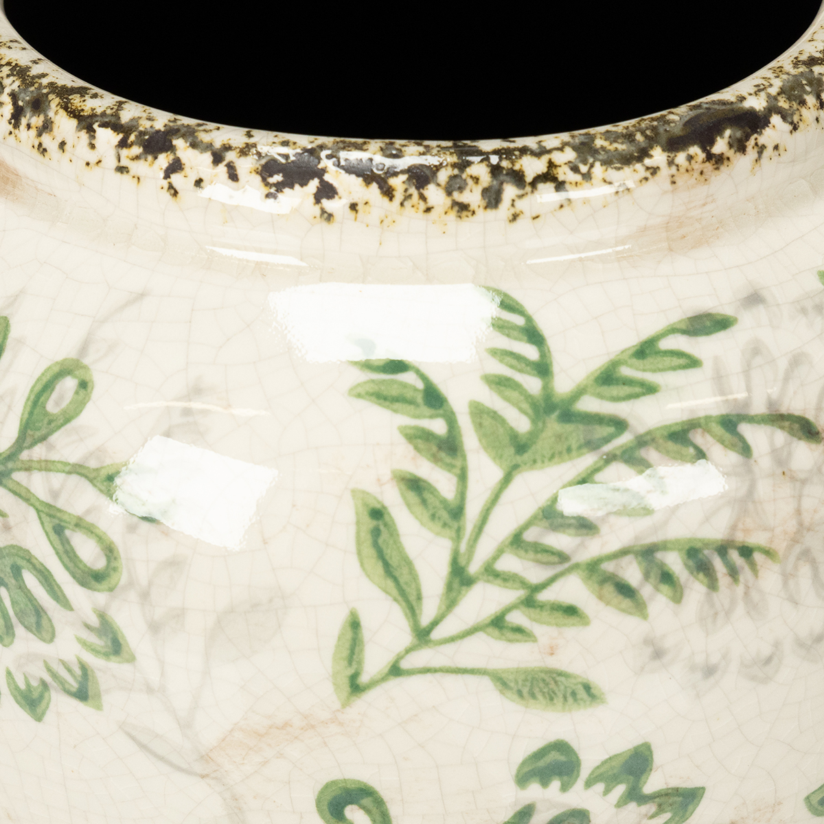 Besonders auffällig: Die liebevolle Handarbeit spiegelt sich in jedem Detail wider. Das Pflanzenmuster wirkt beinahe wie aufgemalt und sorgt für das gewisse Etwas. Der charmant rustikale Look in Kombination mit der hochwertigen Keramik macht die Vase zur perfekten Ergänzung eines natürlichen und gleichzeitig eleganten Raumkonzepts. Kompakt mit 19 cm Höhe ist sie zudem wunderbar vielseitig einsetzbar, sei es im Wohnzimmer, Badezimmer oder in der Küche. Entdecken Sie, wie diese dekorative Vase Ihrem Zuhause neuen Schwung verleiht!