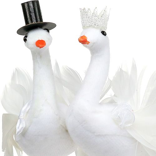 Ein süßes Extra für Ihre Hochzeitsdekoration: Dieses treue Vogel Brautpaar ist liebevoll gestaltet, besitzt echte Vogelfedern als Flügel und ist mit seinen Steckdrähten ineinander verflochten. Die Dame trägt eine silbern glitzernde Krone sowie eine Rose aus Organzastoff an der Seite, während der Herr einen eleganten Zylinder auf dem Kopf hat. Die weißen Tauben haben außerdem hübsche orange Schnäbel, feine schwarze Augen und können mit dem langen Metalldraht sehr einfach zu einem Blumenstrauß in die Vase gesteckt werden.Damit können Sie dann eine wunderschöne Tischdekoration für die Hochzeit stimmungsvoll gestalten. Außerdem können Sie dafür die Deko-Tauben in ein Hochzeitsgesteck einarbeiten und damit beispielsweise den Tisch des Hochzeitspaares schmücken oder Sie nutzen die Deko-Vögel für eine atmosphärische Raumdekoration zur Hochzeitsparty. Darüber hinaus passen die Hochzeitsfiguren auch als pfiffige Kuchendekoration in die Hochzeitstorte. Selbstverständlich können Sie die Figuren auch einzeln verwenden und damit flexibel für Ihre Deko-Ideen zur Hochzeitsdekoration nutzen.