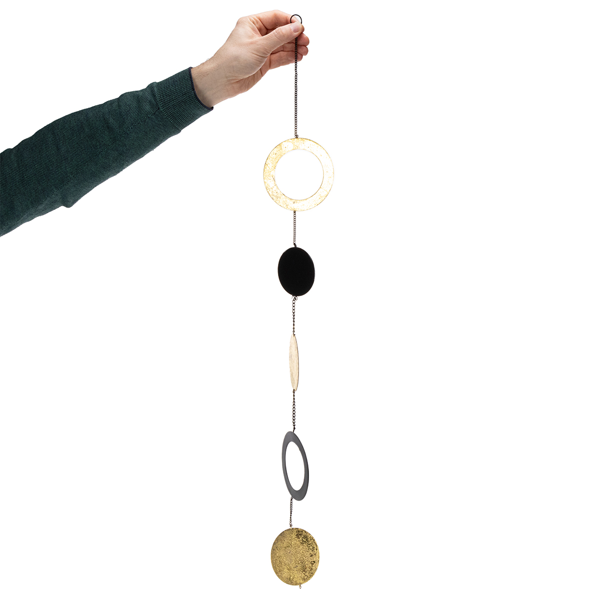 Insgesamt fünf runde Elemente in unterschiedlichen Größen und als Scheiben und Ringe gestaltet wechseln sich bei dieser Deko in Schwarz und Gold ab. Die Kreisformen der Hängedeko sind durch schmale Metallkettchen miteinander verbunden und besitzen an der Oberseite einen kleinen Ring zum Aufhängen.