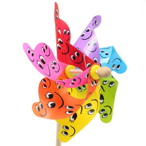 Gestalten Sie mit dieser Windmühle eine farbenfrohe, kunterbunte Sommerdeko, die besonders Kinderaugen zum Strahlen bringen wird! Das lustige Windspiel besteht aus einem sehr stabilen Holzstab, an dem oben Kunststoffblätter angebracht sind, die sich bereits herrlich drehen, wenn ein Windhauch sie erreicht. Dabei trumpft das Dekowindrad vor allem mit seinen bunten Farben und den lustigen Gesichtern, bestehend aus Augen und einem lächelndem Mund. Wer kann bei diesem Anblick schon ernst bleiben?